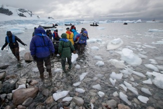 The photo above shows a typical Zodiac landing in Antarctica. This particular landing was at Cuverville Island. The ship can be seen in the upper right.